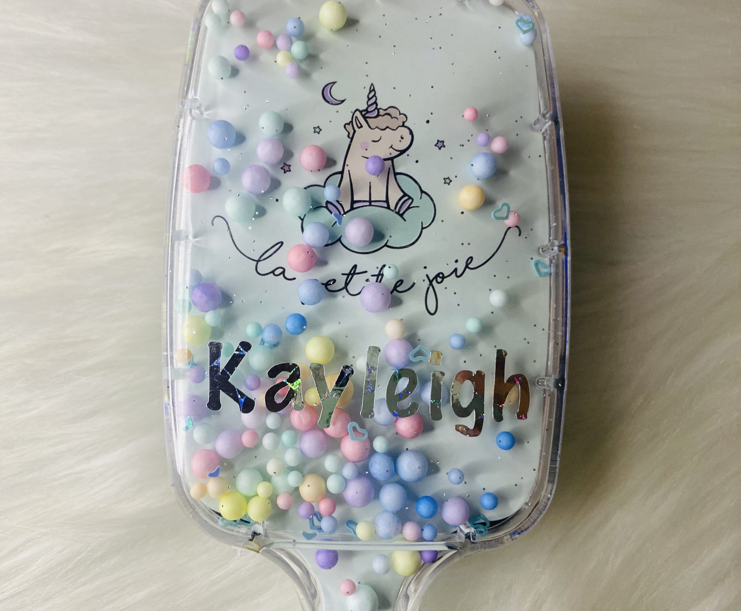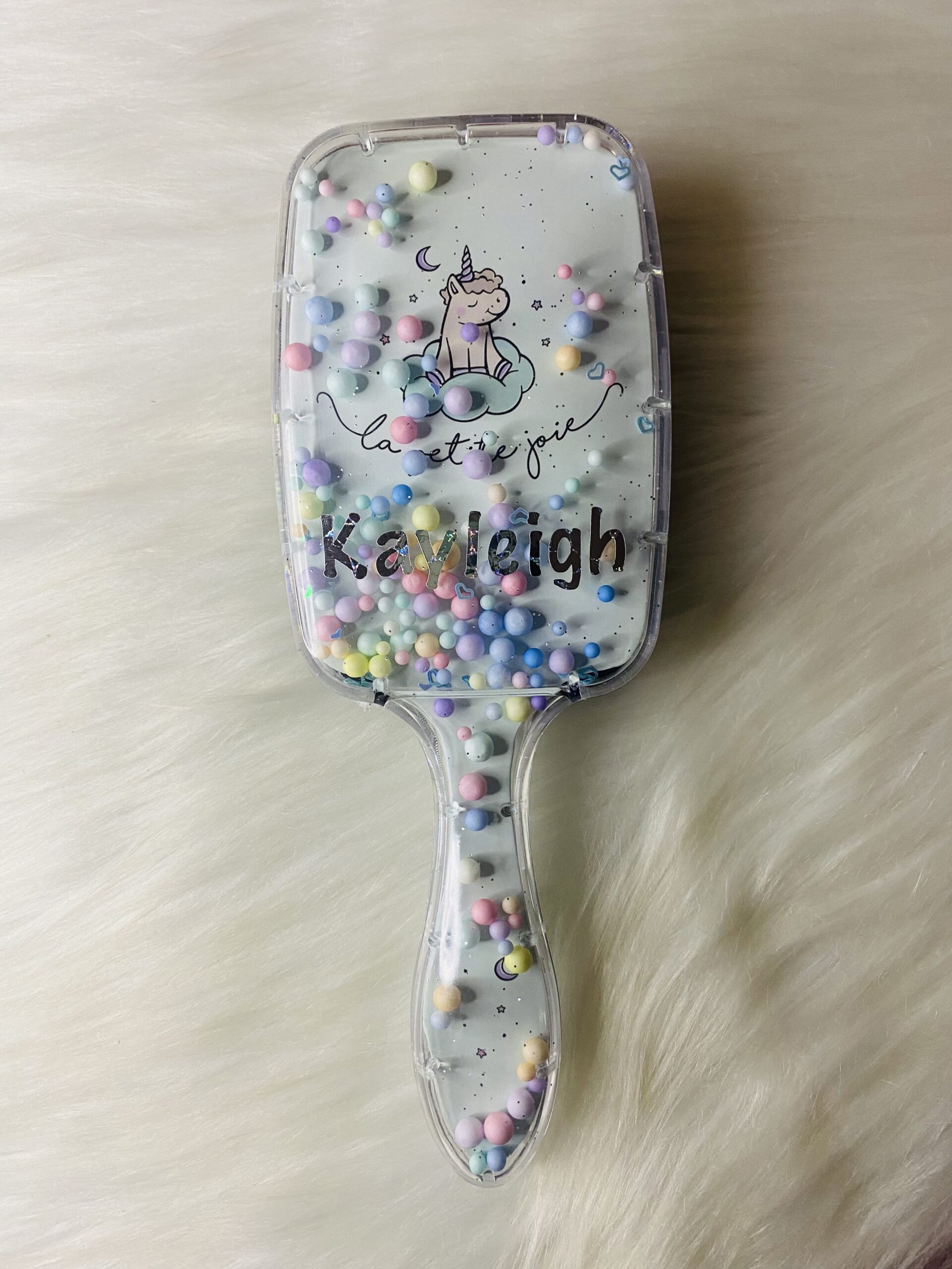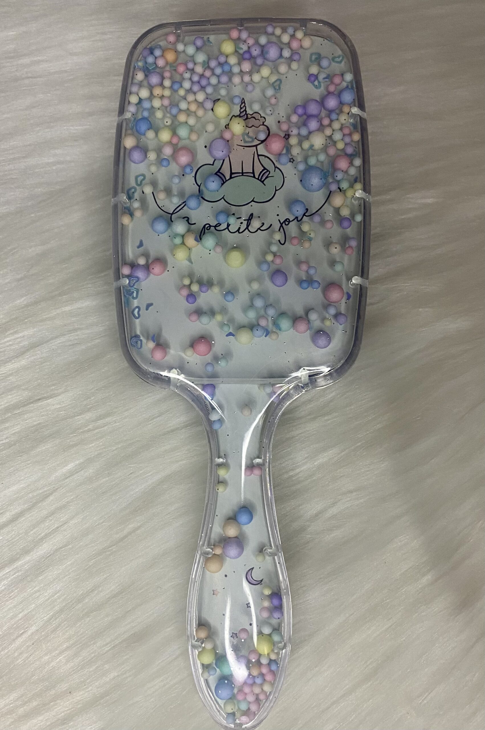Large unicorn detangling hair brush with moveable pastel balls.